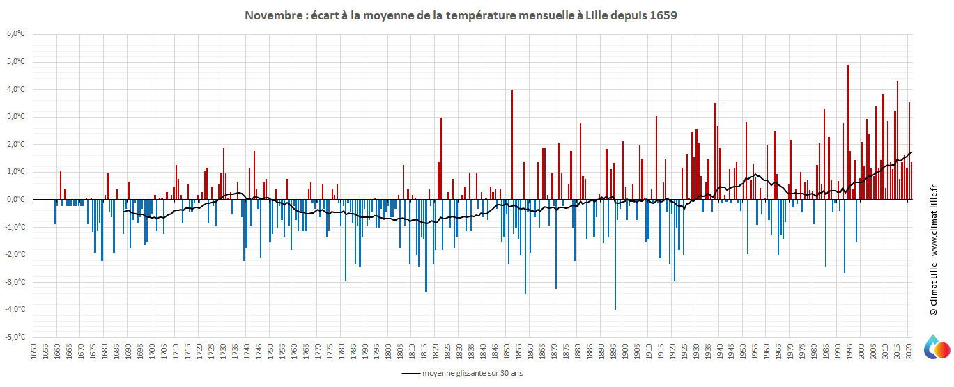 - La normale glissante la plus froide a été observée sur la période 1787-1816, avec une température moyenne en novembre de 5,1°C.